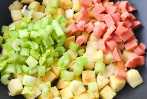 11、翻炒两下后加入刚炒的馒头丁;